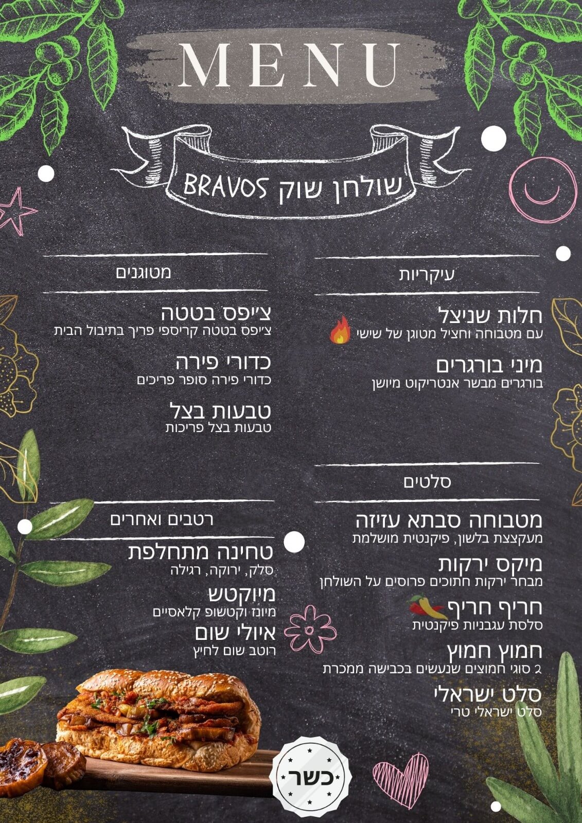 מיני בורגרים, כדורי פירה וצ'יפס בטטה, טבעות בצל ושלל רטבים מעולים וייחודים – והכל הכי טרי שאפשר ומטוגן במקום!