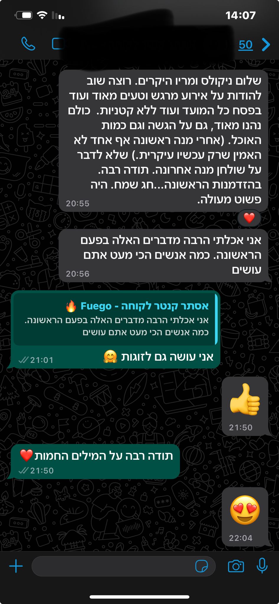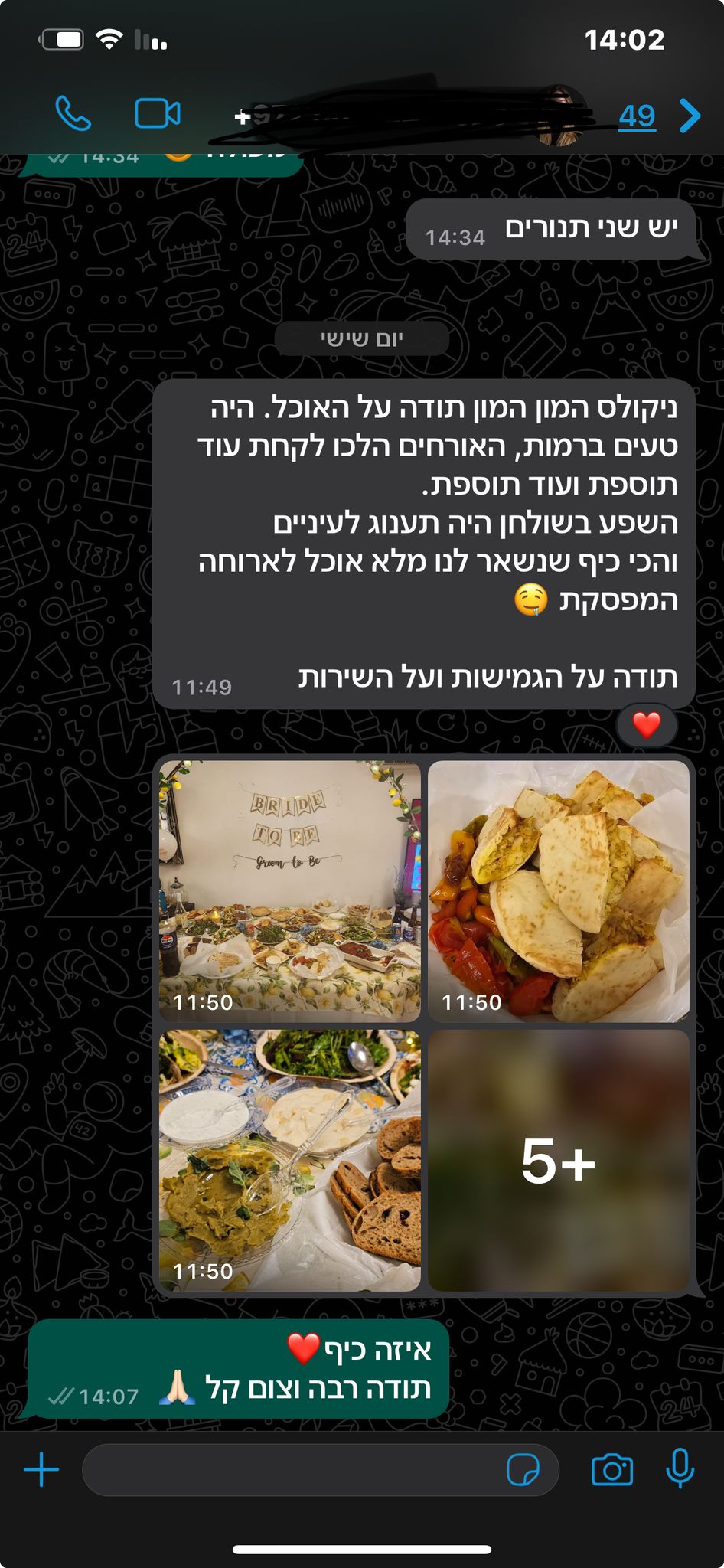 חייגו אלינו והזמינו את חווית הטעמים שכוללת הכל – מהמנות המפוארות ועד לקשר האישי שמביא כל אורח לתוך הסיפור הקולינרי שלי.